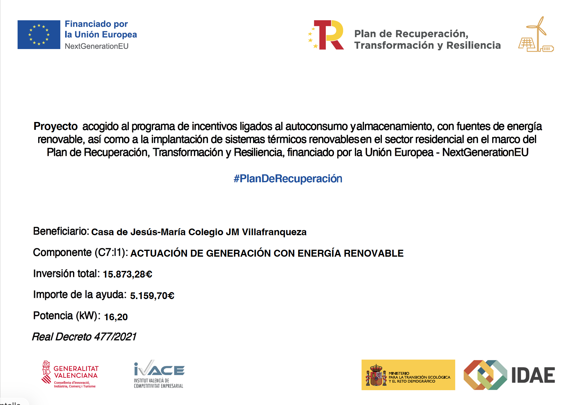 Proyecto acogido al programa de incentivos ligados al autoconsumo y almacenamiento, con fuentes de energía renovable, así como a la implantación de sistemas térmicos renovables en el sector residencial en el marco del Plan de Recuperación, Transformación y Resiliencia, financiado por la Unión Europea- NextGenerationEU.
